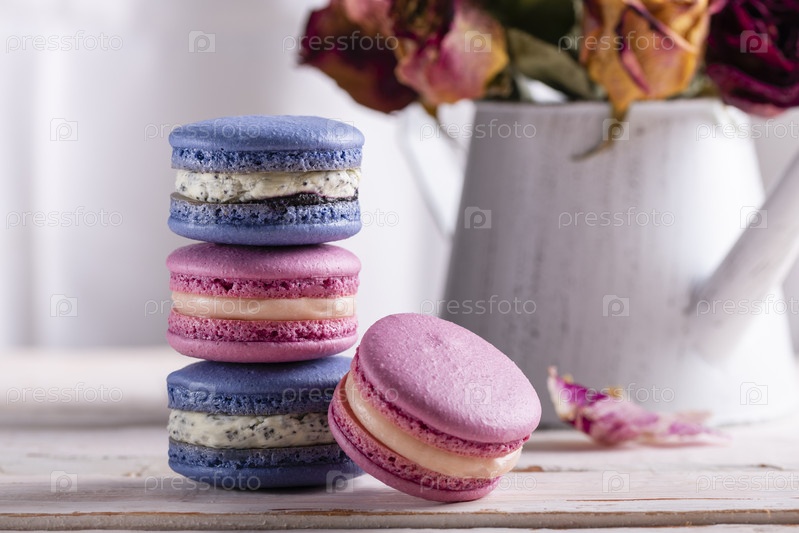 Башня, стопка розового и голубого миндального печенья на светлом фоне крупным планом