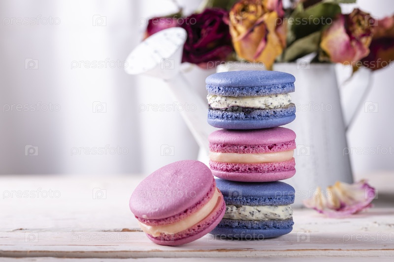 Башня, стопка розового и голубого миндального печенья на светлом фоне крупным планом