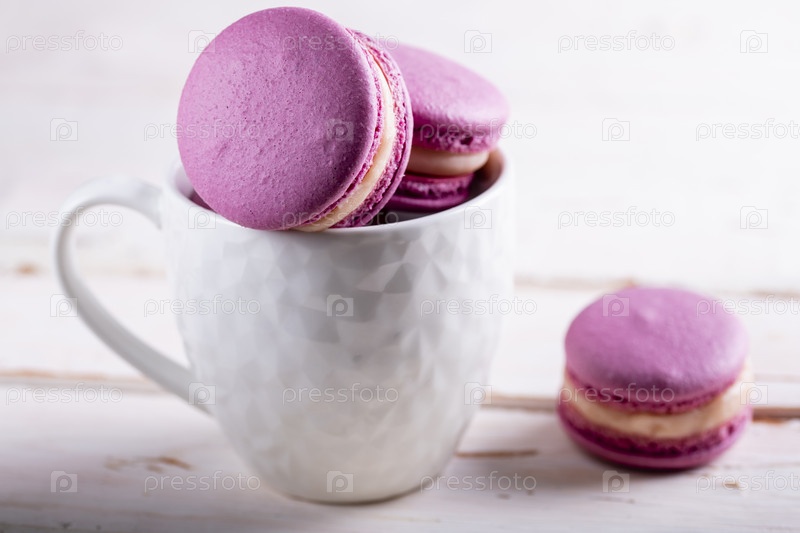 Три розовых миндальных печенья и белая чашка кофе на деревянном столе крупным планом