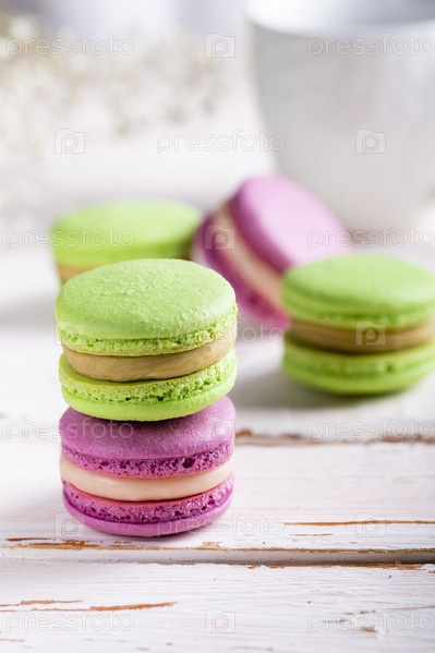 Розовые и зеленые миндальные печенья крупным планом на светлом фоне. Французское миндальное печенье на фото очень вкусное