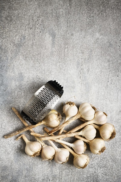 Луковица чеснока и пресс для чеснока на сером фоне, крупным планом, вид сверху