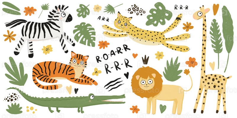 Африканские животные, жираф, леопард, лев, тигр, крокодил, зебра. Стиль каракулей, набор плоских мультяшных животных-сафари. Отдельные элементы на белом фоне. Детский мультипликационный рисунок
