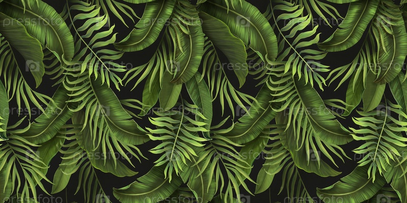 Темные обои с тропическими листьями. Пальмовые листья, банановые листья, темный фон. Джунгли тропический лес бесшовные модели. Ручной рисунок для тканей, одежды, товаров, веб-сайтов