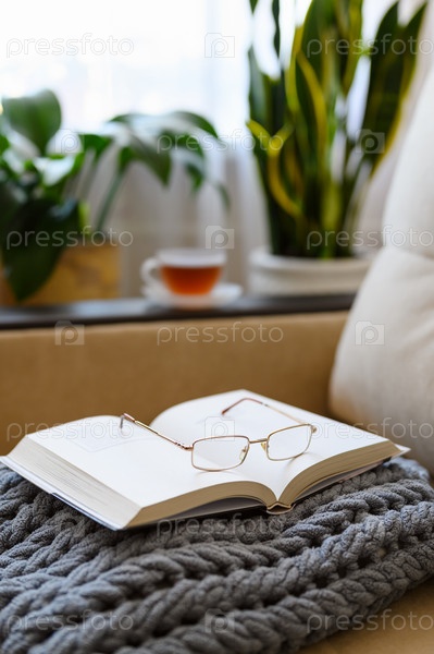 Уютное чтение дома на мягком диване с чашечкой чая. Открытая книга в очках на сером пледе на фоне чашки чая и цветов. Вертикальный формат. Селективный фокус на переплете и гла