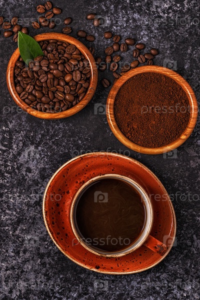 Кофейная чашка, бобы, молотый порошок и сахар