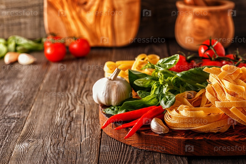 Продукты для приготовления пищи - макароны, помидоры, чеснок, перец и базилик