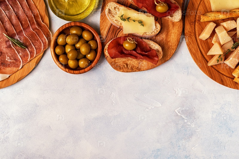 Фон итальянской кухни с ветчиной, сыром, оливками