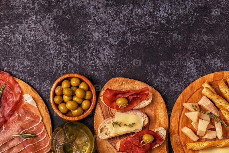 Фон итальянской кухни с ветчиной, сыром, оливками
