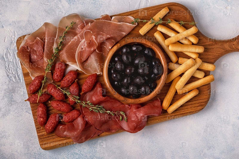Сосиски, оливки, прошутто, хлебные палочки