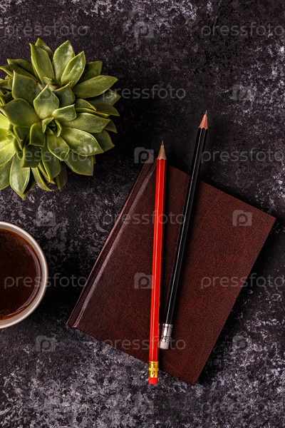Стол с блокнотом, цветком и кофе