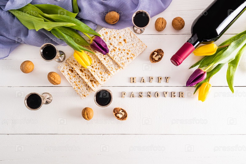 Серебряные бокалы с красным вином, маца, бутылка вина и тюльпаны на белом деревянном фоне. деревянные буквы пасха