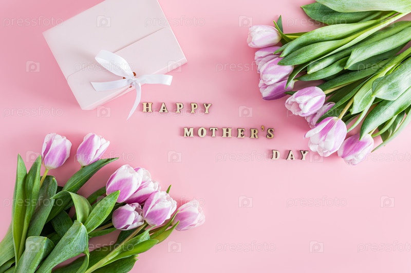 Праздничная композиция с фиолетовыми тюльпанами и текстом деревянными буквами с Днем матери. вид сверху. плоская укладка. розовый фон