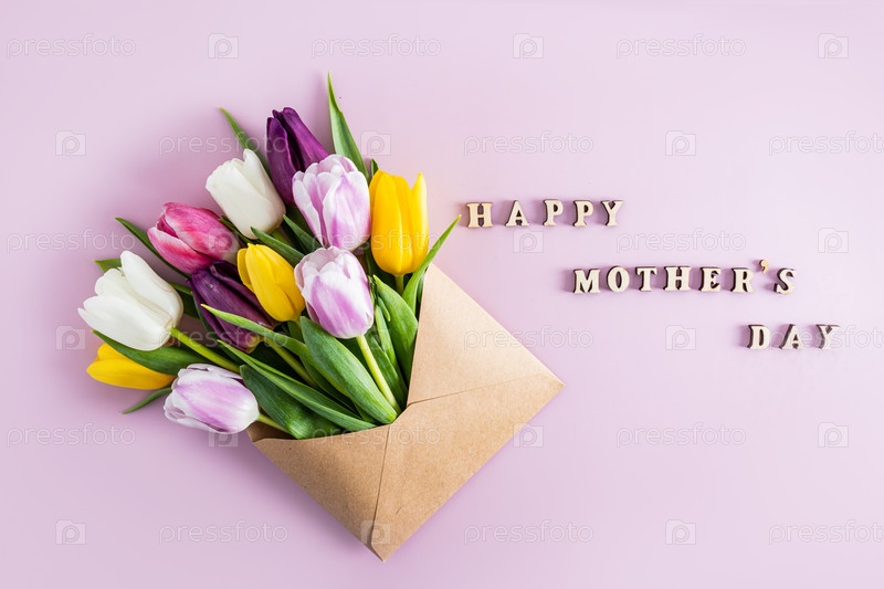 Красивая весенняя композиция ко Дню матери. разноцветные тюльпаны в крафтовом конверте. вид сверху. плоская планировка. текст деревянные буквы