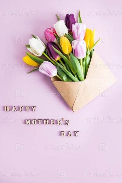 Букет разноцветных весенних тюльпанов в крафтовом конверте. вертикальный творческий вид. розовый фон. текст счастливого дня матери