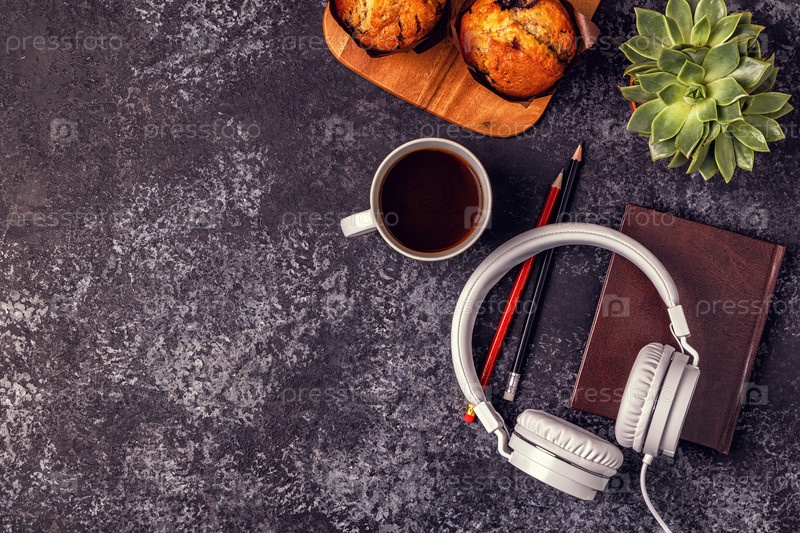 Стол с блокнотом, наушниками и кофе