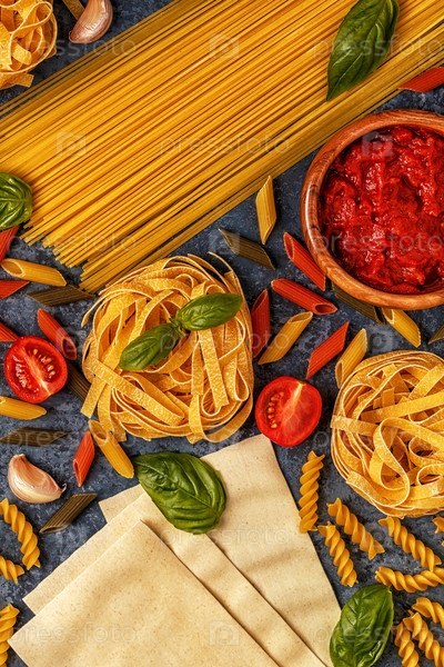 Фон итальянской кухни с макаронами, специями и овощами