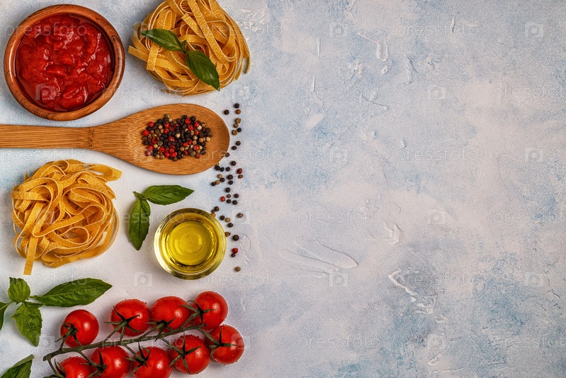 Фон итальянской кухни с макаронами, специями и овощами