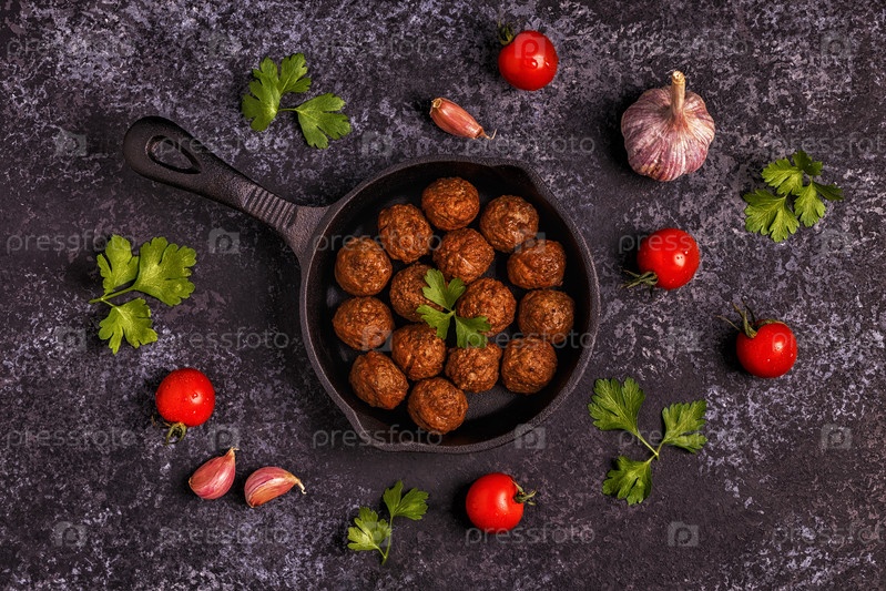 Жареные фрикадельки с помидорами, чесноком и петрушкой