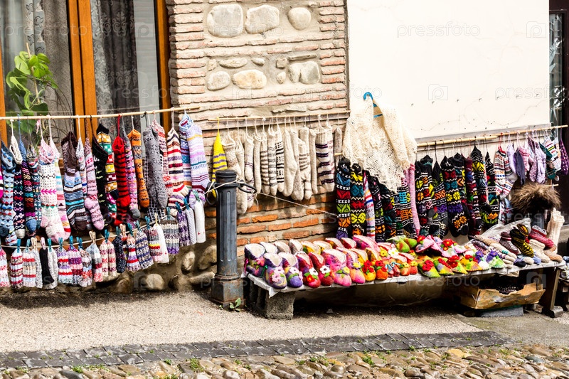 Уличный рынок в городе Сигнаги, на улице продаются носки, шерстяные тапочки и яркие сувениры. Кахетия, Грузия