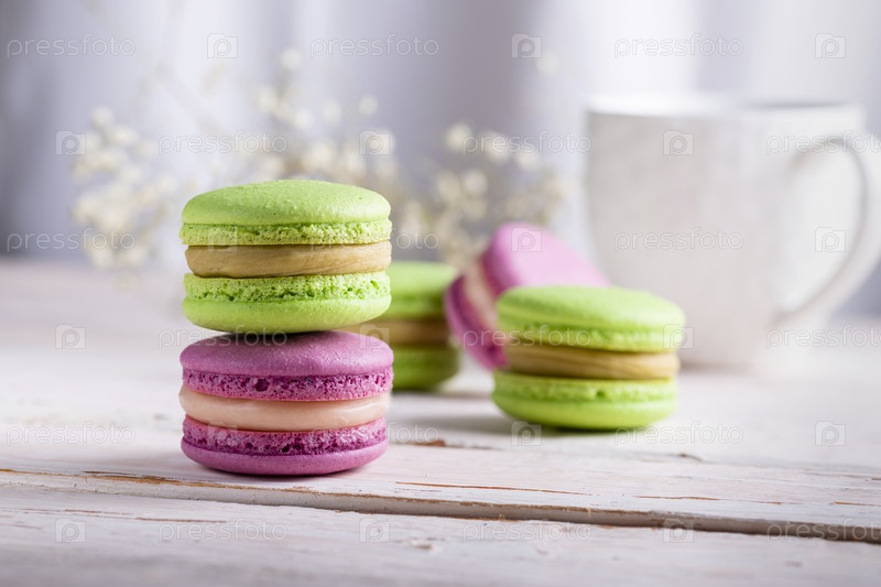 Два цветных миндального печенья крупным планом на деревянном белом столе. Концепция яркого подарка