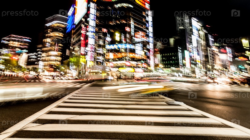 Размытое движение автомобилей, размытое абстрактное движение города. Ночной переход Гиндза, Токио, Япония