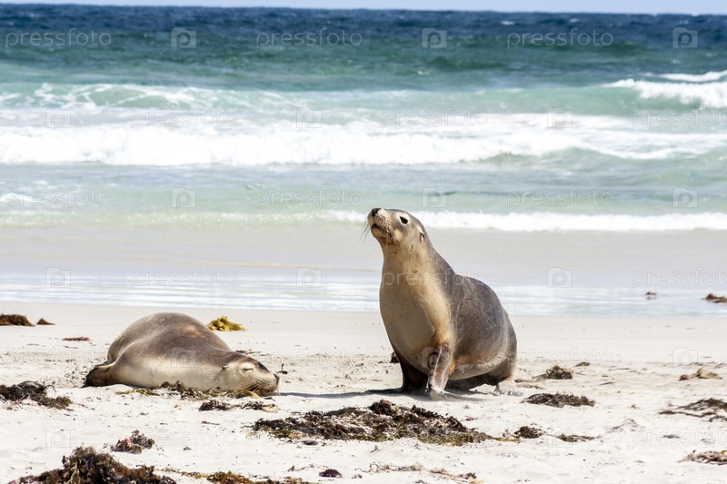 Два больших австралийских морских льва (Neophoca cinerea) на песчаном пляже.Остров Кенгуру, Южная Австралия