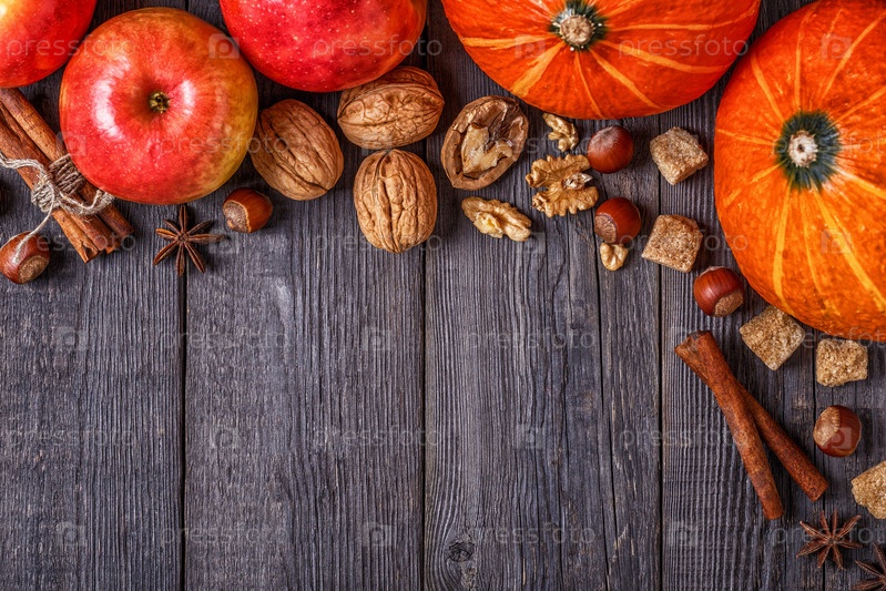 Деревянный фон с тыквой, яблоками, орехами и специями