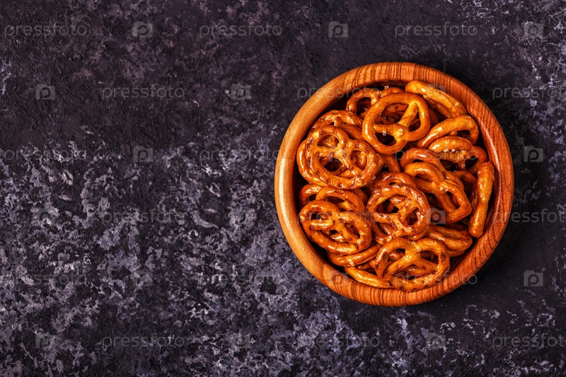 Соленый крендель в миске на каменном фоне