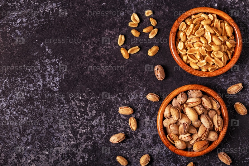 Соленые фисташки и арахис на каменном фоне