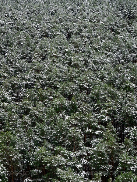 Верхушки сосен, покрытые белым снегом в лесу