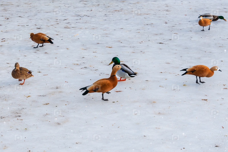 Зимующие водоплавающие птицы. Утки, водоплавающие птицы на берегу зимнего пруда. Зимний пейзаж с утками