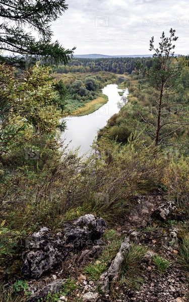 Типичный осенний уральский пейзаж с видом на реку и лес