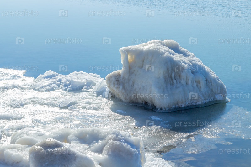 Крупный план ледяного берега, замерзших волн, скал и солнечных бликов на льду