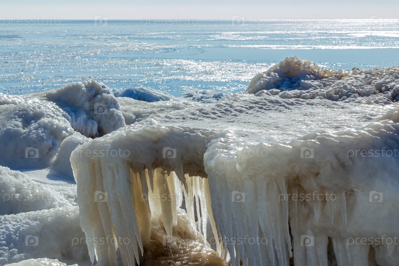 Крупный план ледяного берега, замерзших волн, скал и солнечных бликов на льду