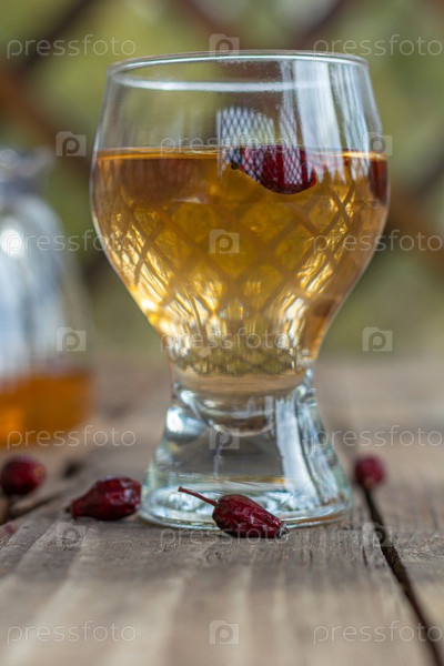 Красный чай в прозрачной чашке на деревянном столе, чай из шиповника, деревенский