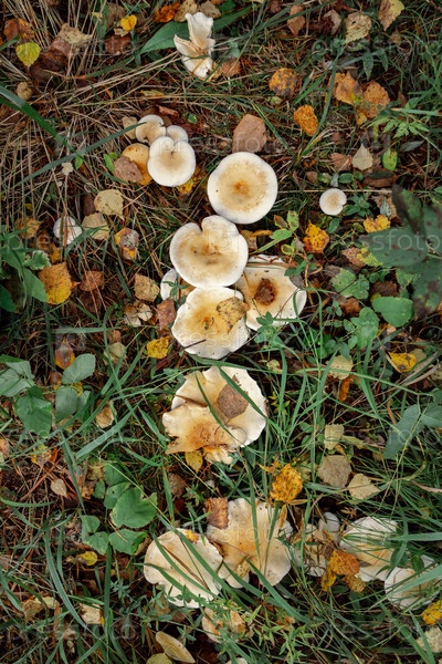 Грибы мухомор в траве с осенними листьями
