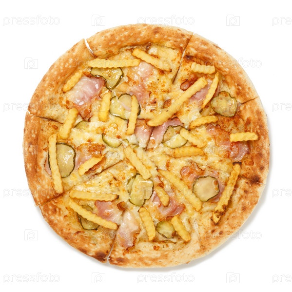 Вид сверху на итальянскую пиццу с картофелем фри, ветчиной и маринованными огурцами на белом фоне