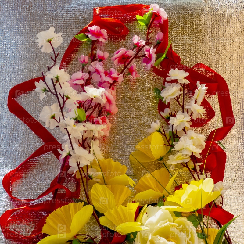 Фигура 8 из ленты и искусственных цветов для празднования Международного женского дня на серебряном фоне с местом для текста