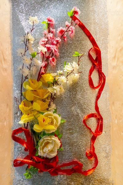 Фигура 8 из ленты и искусственных цветов для празднования Международного женского дня на серебряном фоне с местом для текста