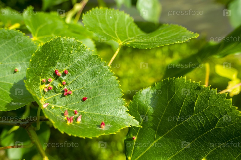 Известковый галл, вызванный красным ногтевым гальским клещей Eriophyes tiliae на липовых листах обыкновенной