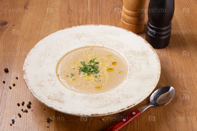Грибной крем-суп на деревянном столе. Грибной крем-суп с зеленью в белой тарелке на деревянном фоне. Сливочный суп из шампиньонов, овощей и сливок
