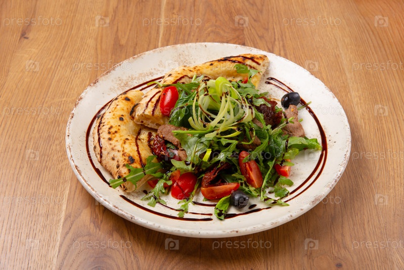 Итальянский салат из говядины с фокаччей в большом блюде на деревянном столе