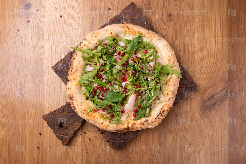 Итальянская пицца Мелаграно, приготовленная в духовке, с сыром Моцарелла, ветчиной, говядиной, рукколой, зернами граната, базиликом и оливковым маслом