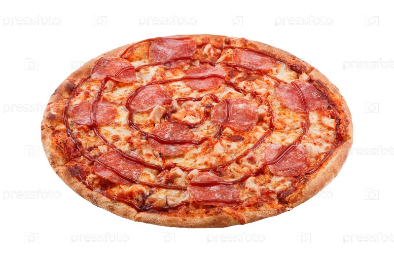 Вкусная классическая итальянская пицца Пепперони с сосисками, курицей и сыром моцарелла на белом фоне. Вид сбоку