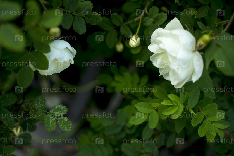 Белый цветок шиповника на темно-зеленом фоне. Два цветка в паре
