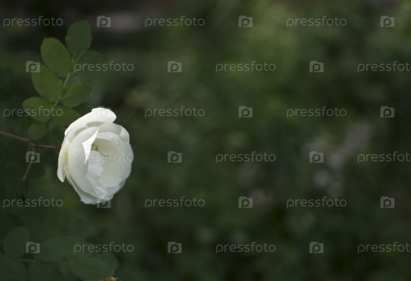 Белый цветок шиповника на темно-зеленом фоне. Копировать пространство