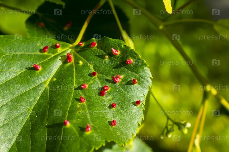 Известковый галл, вызванный красным ногтевым гальским клещей Eriophyes tiliae на липовых листах обыкновенной