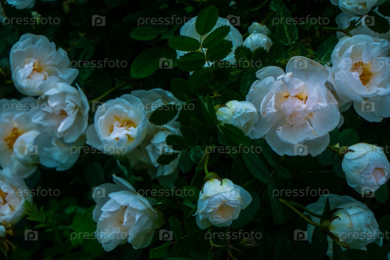 Белый цветок шиповника на темно-зеленом фоне