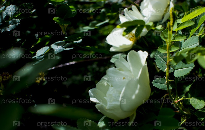 Белый цветок шиповника на темно-зеленом фоне