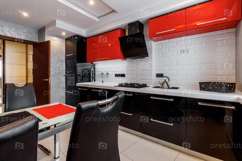 Современный интерьер кухни с красными и черными шкафами и белым керамическим полом